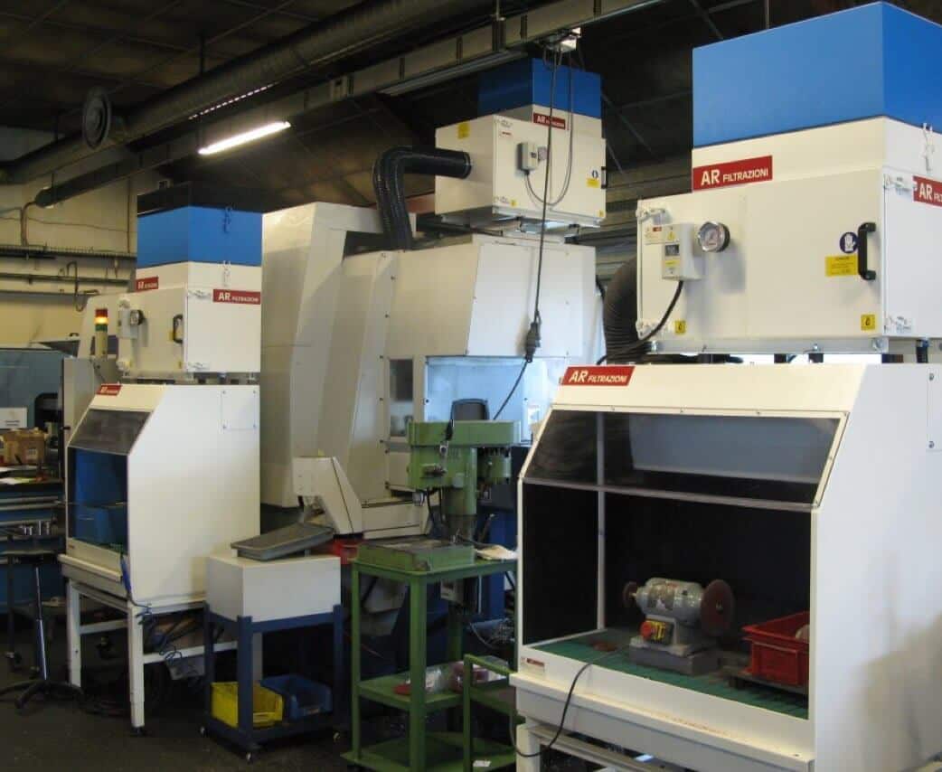 Diese Tätigkeiten verursachen nicht nur sehr viel gesundheitsschädlichen Staub und verschmutzt die Arbeitsumgebung, sehr feine Aluminium- oder Titanstäube bergen auch eine Brandgefahr und sind explosiv. AR FILTRAZIONI ist mit seiner über 35 jährigen Erfahrung im Stande, Komplettlösungen für die Problematiken dieser Bearbeitung zu bieten. Im obigen Foto ist ein Luftrieniger auf einer Abblasbank zu sehen. Diese Anlage beugt Bränden an Magnesium bearbeitenden Maschinen vor.