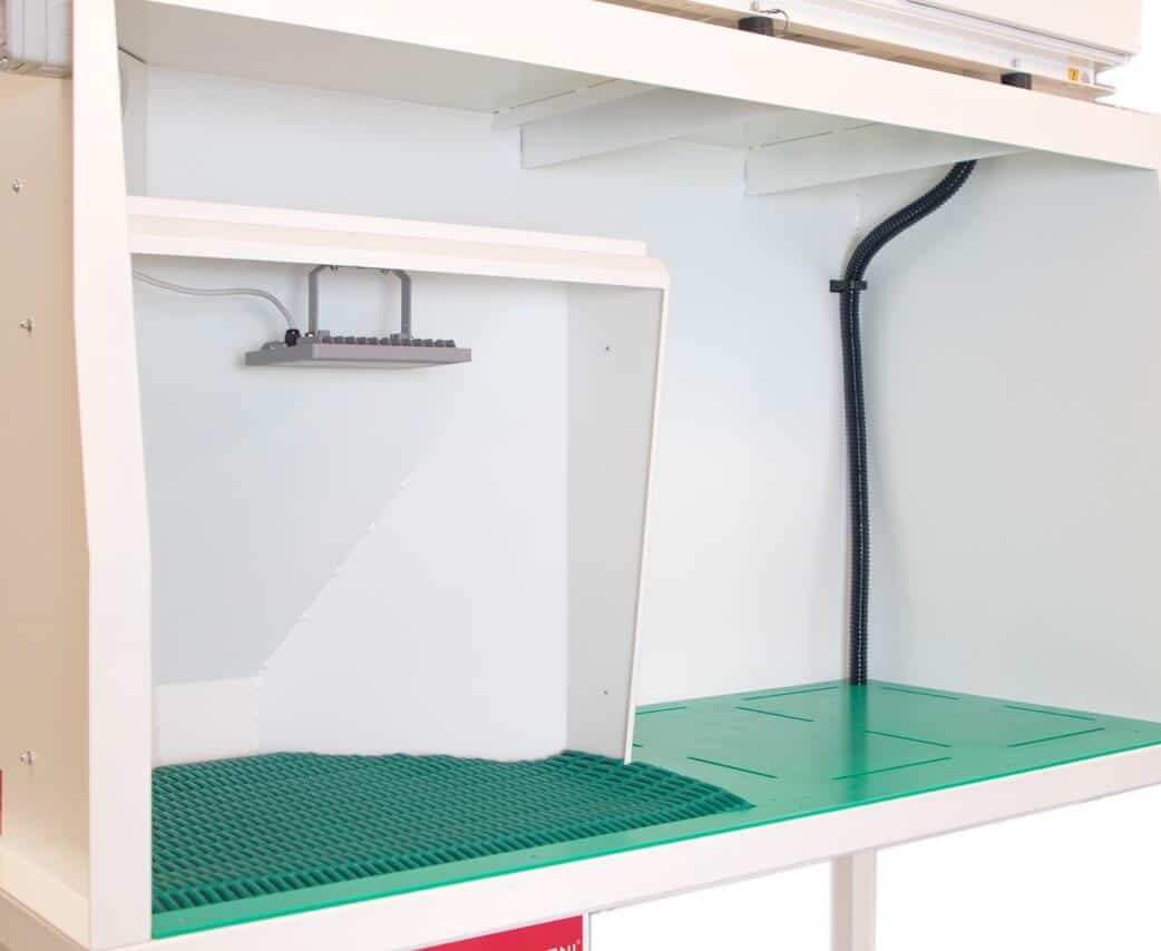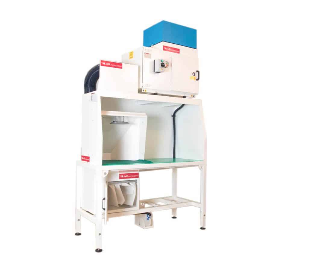Umweltfreundliche Abblaskabinen und Bänke, mit einem ergonomischen Design für einen komplett sauberen Arbeitsplatz ohne Verteilung von Staub und Span in der Umgebung oder auf saubere Werkstücke.
